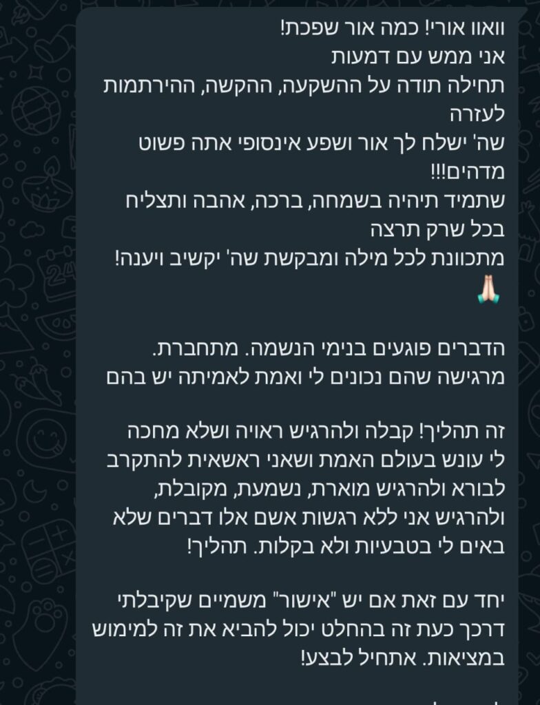 לקוחות פונים אליי כי הם מרגישים את האנרגיה. משהו עובר עוד לפני המילים – ומשם מתחיל הקשר.